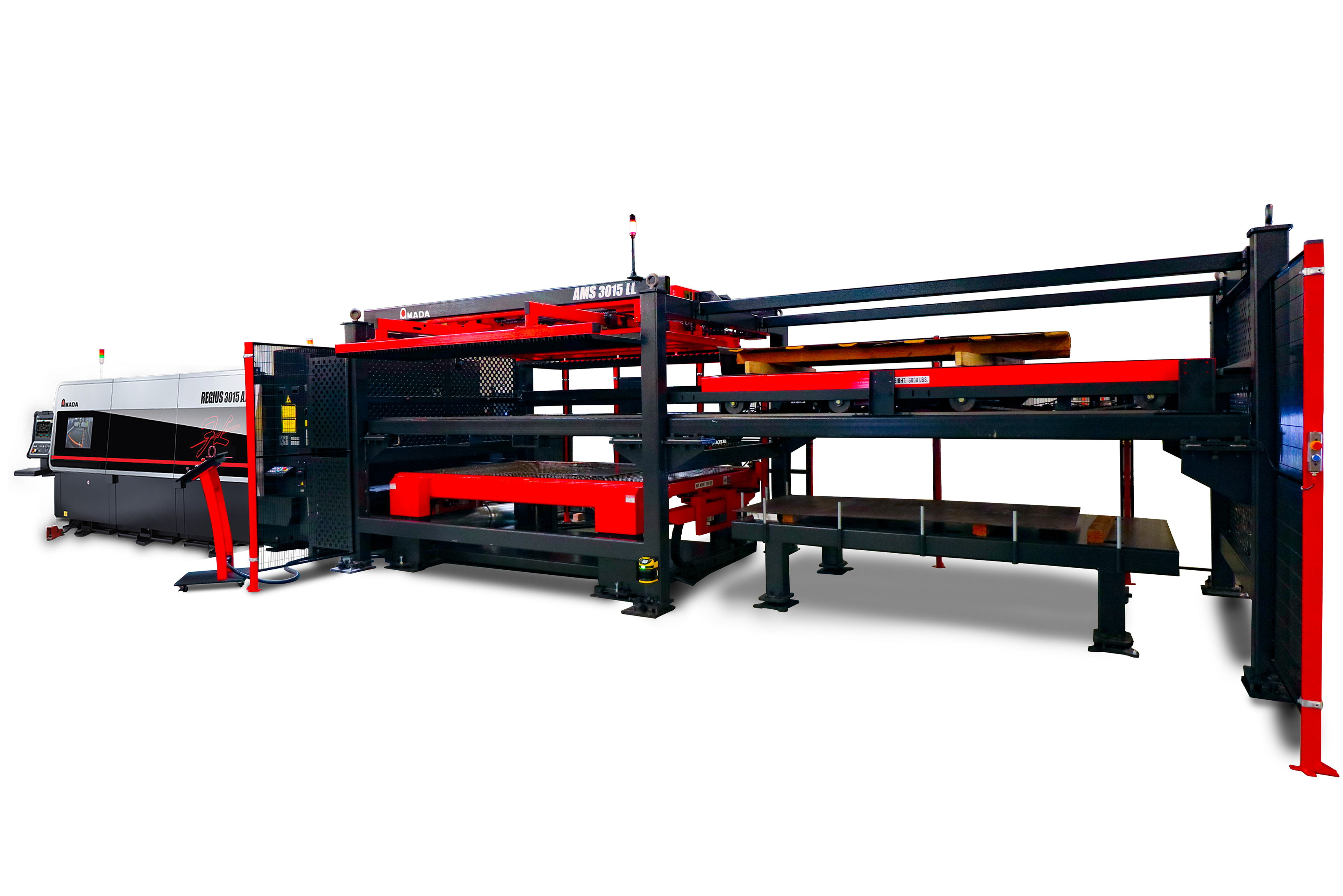 Fiber Laser Cutting System paired with Linear Loading (LL) AMADA's REGIUS Series fiber lasers combine the world's fastest 3-axis linear drive system with a variety of autonomous features to ensure high-speed, continuous operation. The AMS 3015 LL (Linear Loader) is designed for shops requiring a narrower footprint. If your ability to add automation to your laser is limited due to walls, aisle ways, or other equipment, the AMS-LL can be a solution by keeping the system roughly the same width as the laser itself.